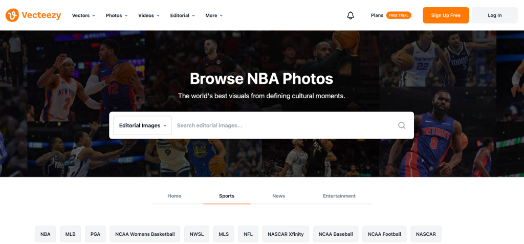 Vecteezy’s editorial collection spans three major verticals: sports, entertainment, and news, with a particularly deep sports catalog covering recent games and events.